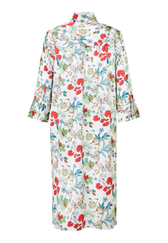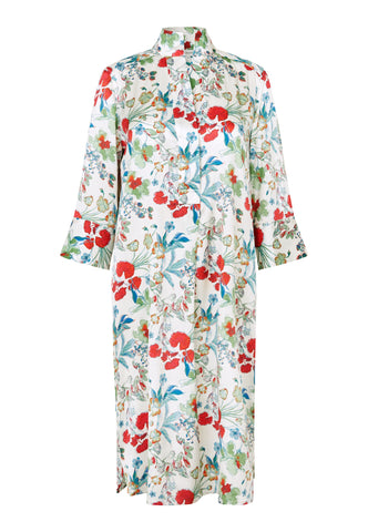 Surely one of Dea Kudibal’s most popular and signature styles, this easy fit mid-calf length dress is perfect for all body shapes. The kimono neckline and collar give it an elegance whilst the deep sleeves with cover buttons have a relaxed attitude. This beautiful version comes in off white silk with printed spring flowers.