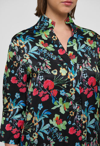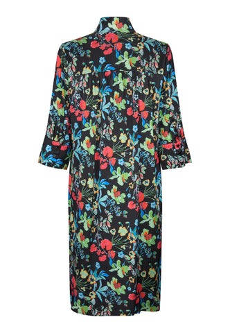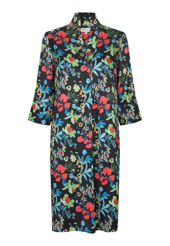 One of Dea Kudibal’s most popular and enduring styles, this easy fit mid-calf length dress is perfect for all body shapes. The kimono neckline and collar give it an elegance whilst the deep sleeves with cover buttons have a relaxed air. This dramatic version comes in black silk with bold printed flowers scattered across the whole body.