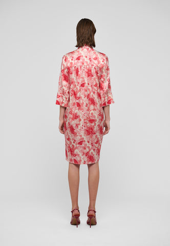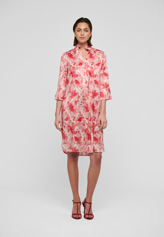 One of Dea Kudibal’s most popular and well known styles, this easy fit mid-calf length dress is perfect for all body shapes. The kimono neckline and collar give it an elegance whilst the deep sleeves with cover buttons have a laidback air. This chic version is in silk with bold red exotic flowers printed onto a pale background.