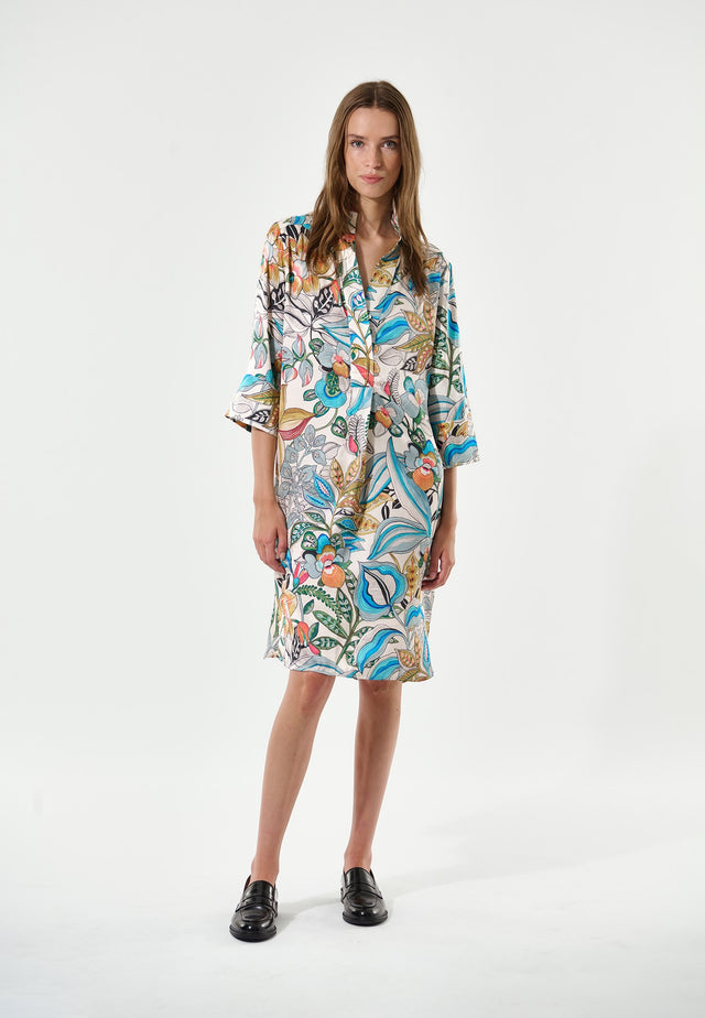 One of Dea Kudibal’s most enduringly popular styles, this easy fit mid-calf length dress is perfect for summer living. The kimono neckline and collar give it a sophisticated elegance whilst the deep sleeves with cover buttons have a relaxed air. This chic version comes in a bold paisley print on silk twill.