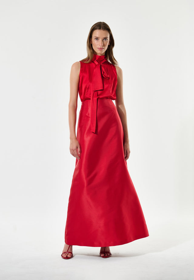Chic and elegant, this sleeveless, regular fit top in flame red stretch satin is the epitome of sophistication. The high stand collar forms a scarf that can be tied in many ways to suit different moods and the slit at the back gives a little glimpse of skin.