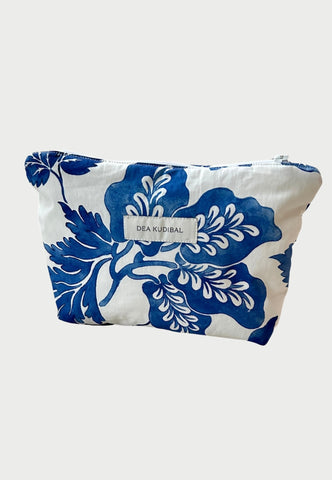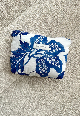 Elegant Dea Kudibal zip pouch in white with a bold blue floral print. Ideal for make-up, small essentials, or travel—finished with the brand’s signature graphic prints and a clean, practical design.