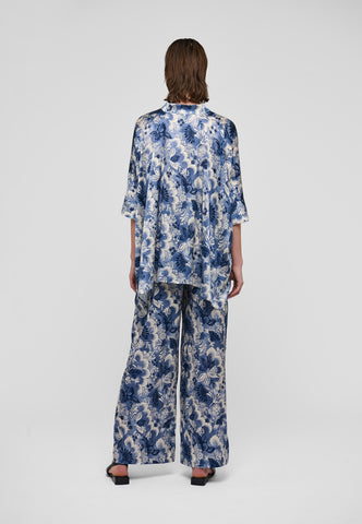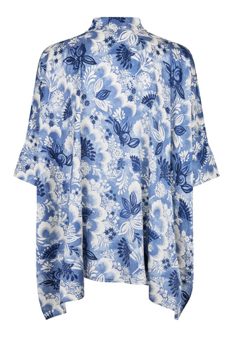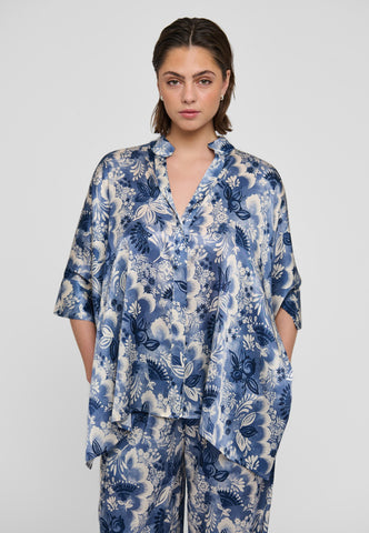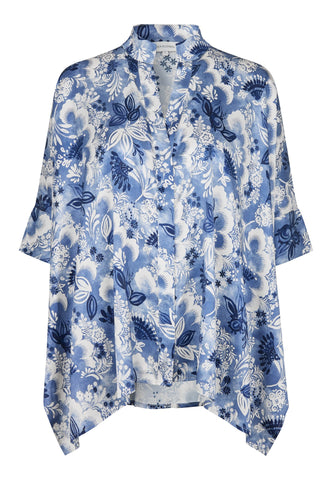 Oversized and easy to wear, this very wide cut silk blouse in a beautiful print of blue flowers has 3/4 length sleeves, a hidden button front and a small stand collar. Wear with jeans for a casual day look or dress it up with a skirt for evening.