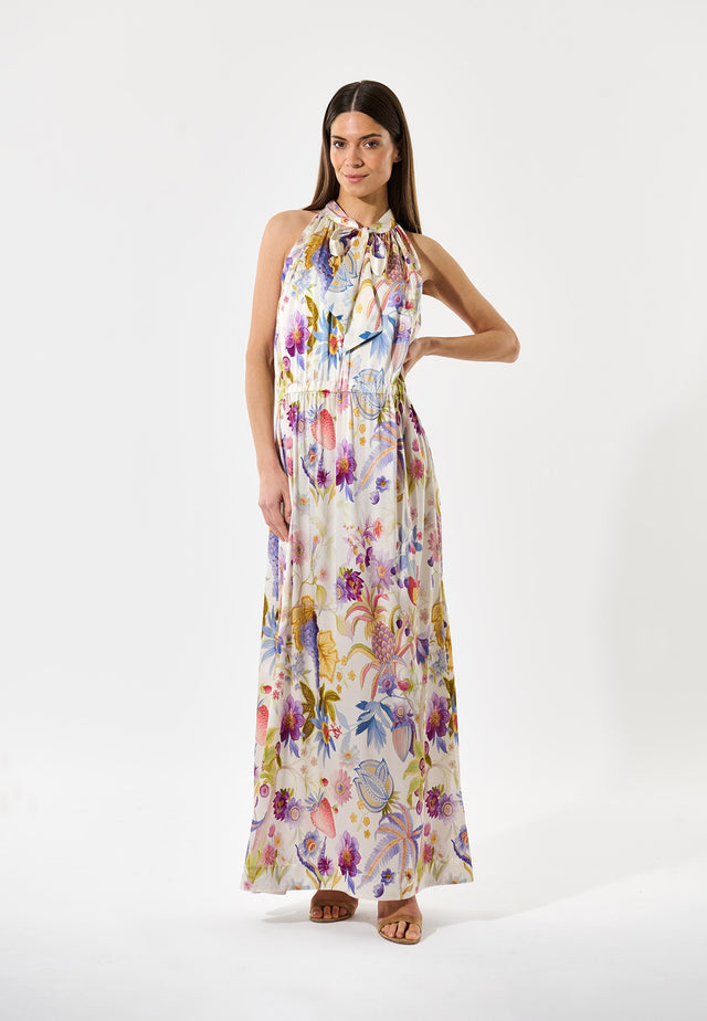 Glamorous and sophisticated, halterneck dresses always add a dose of true style to evening. This full length version has a scarf neck that can be tied in multiple ways and deep slits at the side. The silk satin fabric is printed with beautiful painterly flowers.