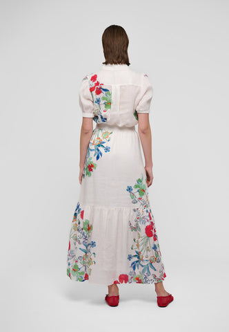 Painterly flowers cascade down this full length linen skirt. A deep flounce adds a further volume and a sense of ease to a skirt that works both for day and evening.