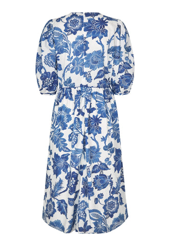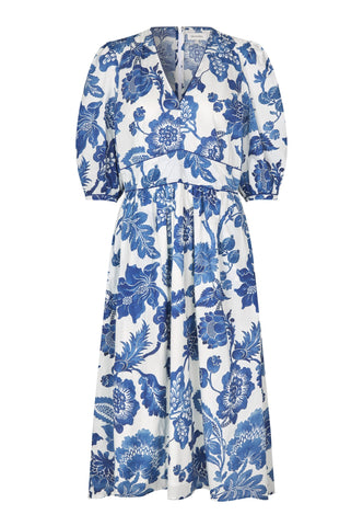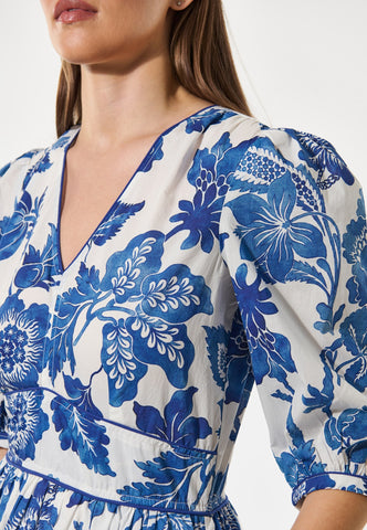 A shaped panel at the waist, defined by contrast piping, accentuates the waist in this pretty cotton voile dress with v neck, printed in large blue flowers. Full elbow length sleeves add to the feminine silhouette as does a flared skirt that falls to mid calf.