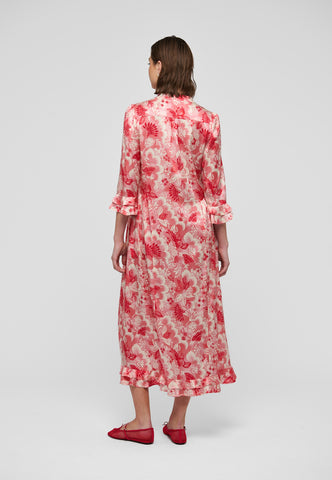 A bold red floral print on silk twill gives this ankle-length dress with 3/4 sleeves a real presence - it is both striking and very chic. There are double ruffles on the cuffs and at the back hem and gathering on the sleeves.