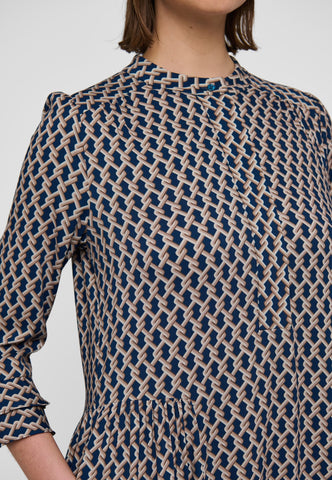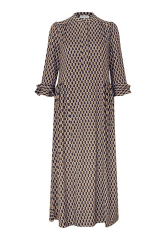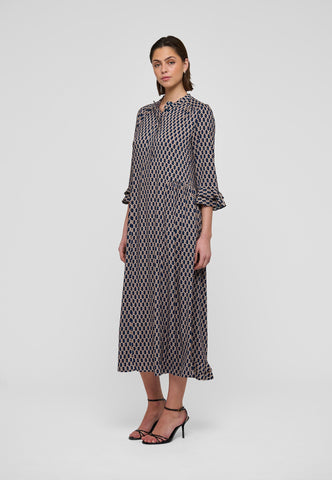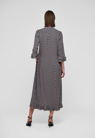 A small graphic print on viscose crepe gives this ankle-length dress with 3/4 sleeves a sophisticated air - it is both classic and very chic. There are double ruffles on the cuffs and at the back hem and gathering on the sleeves.