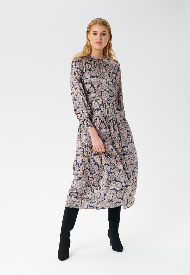 With its long, full tiered skirt, high collar and voluminous sleeves, this maxi dress evokes the glamour of the 1970s but rendered in a print of delicate poppies in moody colours, it retains a sense of contemporary luxury. The dress is made from 90% stretch silk satin and 10% elastane.