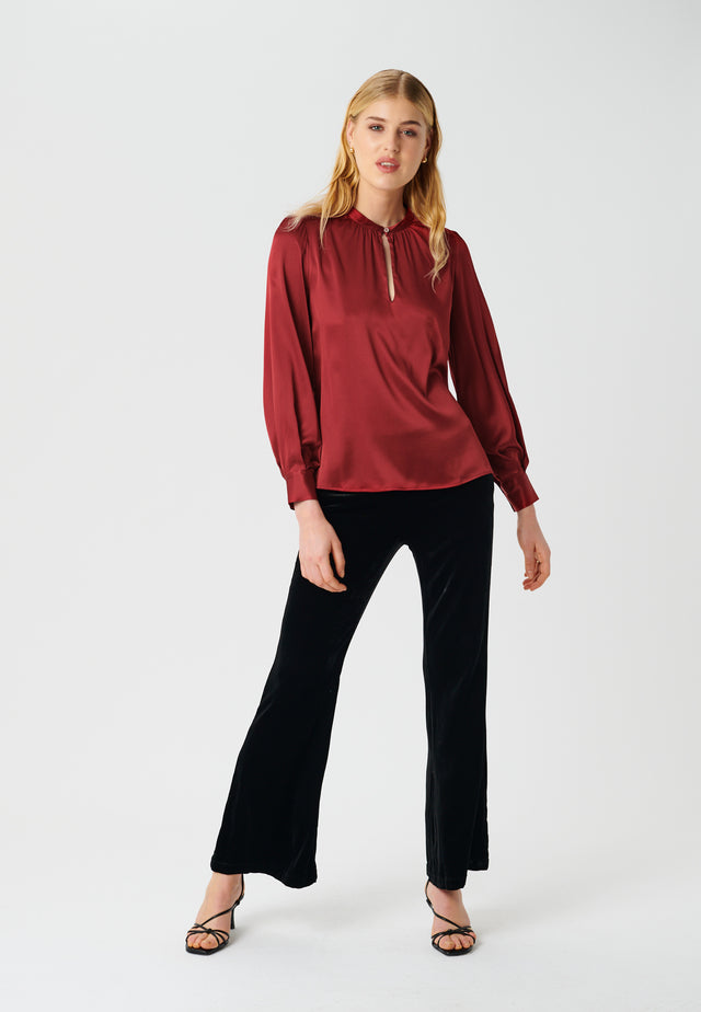 A simple stand collar and keyhole opening at the front are just enough detail to make this luxurious silk blouse something special. In this deep cranberry pink, it makes an elegant and wearable addition to your wardrobe. The blouse is made from 90% stretch silk twill and 10% elastane.