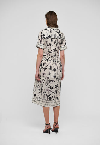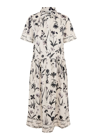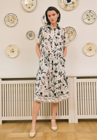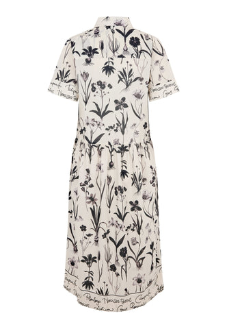 A classic shirt collar makes a neat detail on this pretty short sleeved dress in cotton voile printed with botanical drawings and edged with a contrast print. The skirt falls to just below the knee and side pockets give it a relaxed attitude.