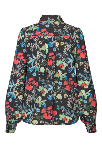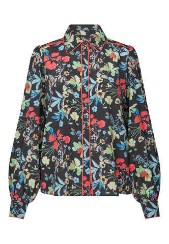Bold red piping runs around the collar, across the shoulder and down the front of this floral printed silk shirt creating a graphic, modern twist on a classic garment. It is in a regular fit with full sleeves and a hidden button placket.