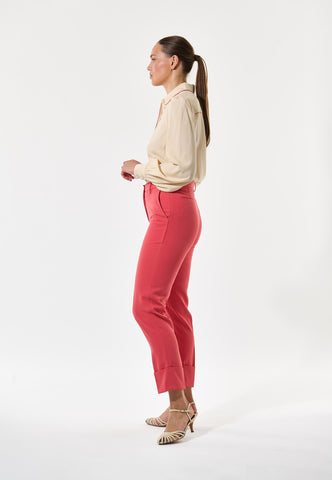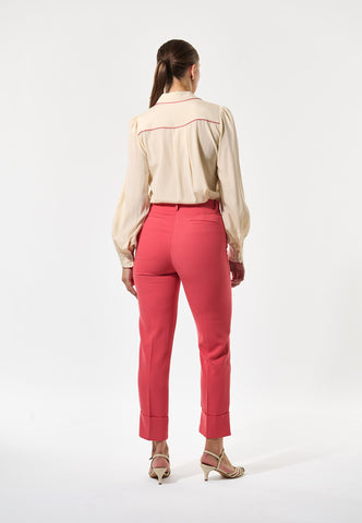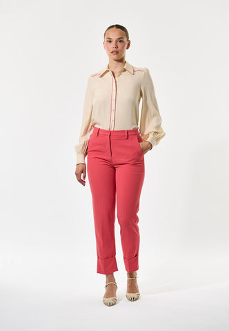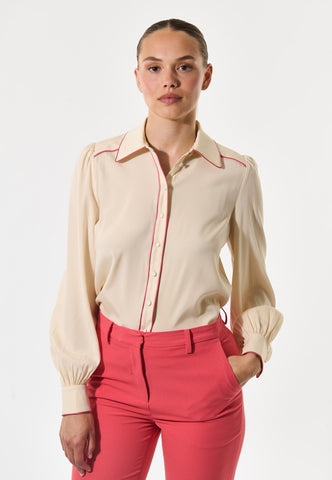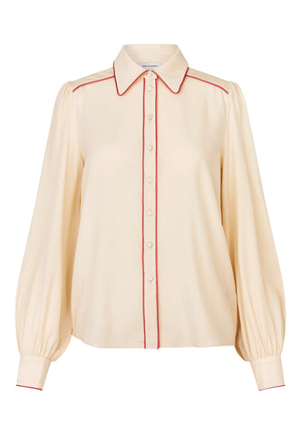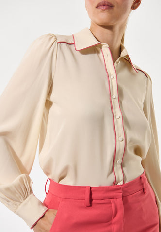 Running around the collar, across the shoulder and down the front of this cream silk shirt is bright red piping giving a graphic contemporary edge to a classic garment. It is in a regular fit with full sleeves and a hidden button placket.