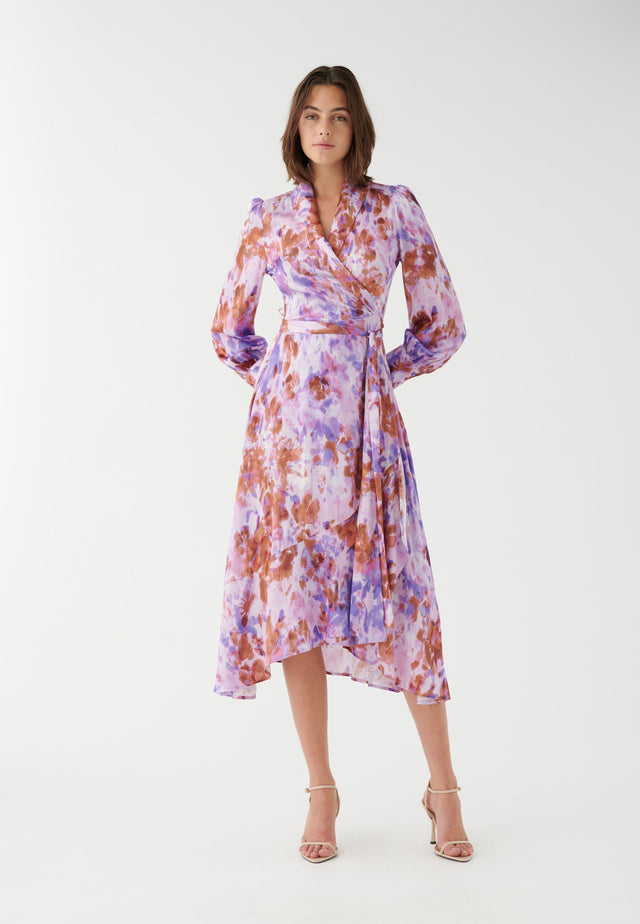 Bringing a touch of tropical drama into your wardrobe, this beautiful wrap dress has a wide flounce around the hem and front and full sleeves. In an abstract floral print in shades of pink and mauve, it can be pulled in at the waist to give a feminine and shapely silhouette.